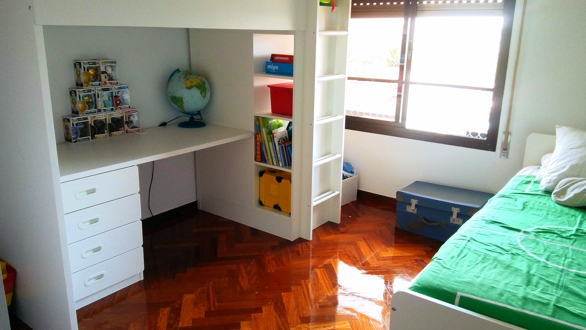 Zona de escritorio de uno de los hermanos. En los cajones se organiza el material de papelería. Los juegos van a la estantería.